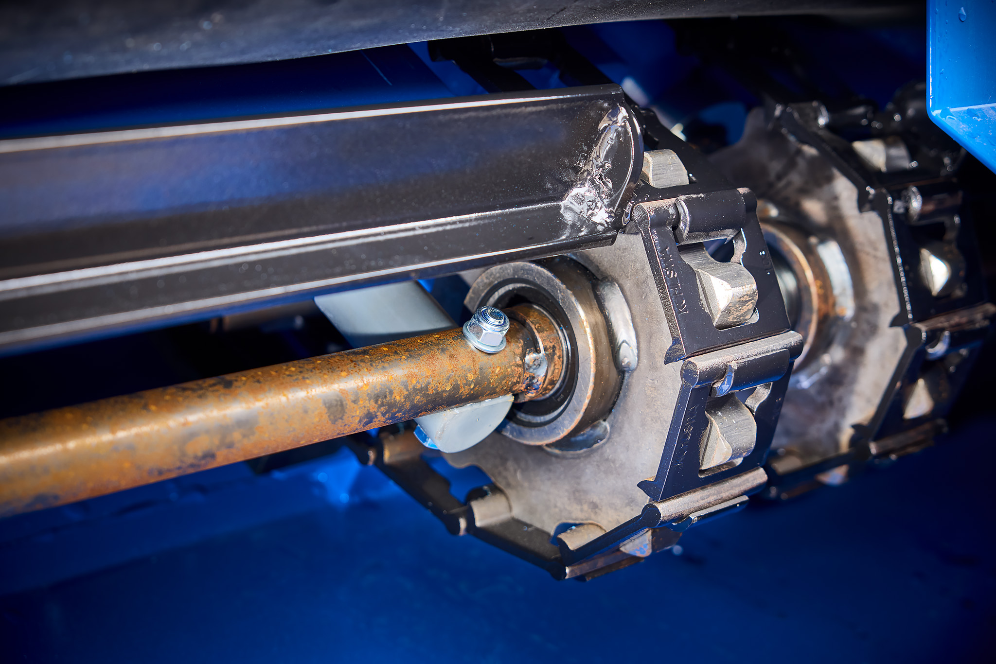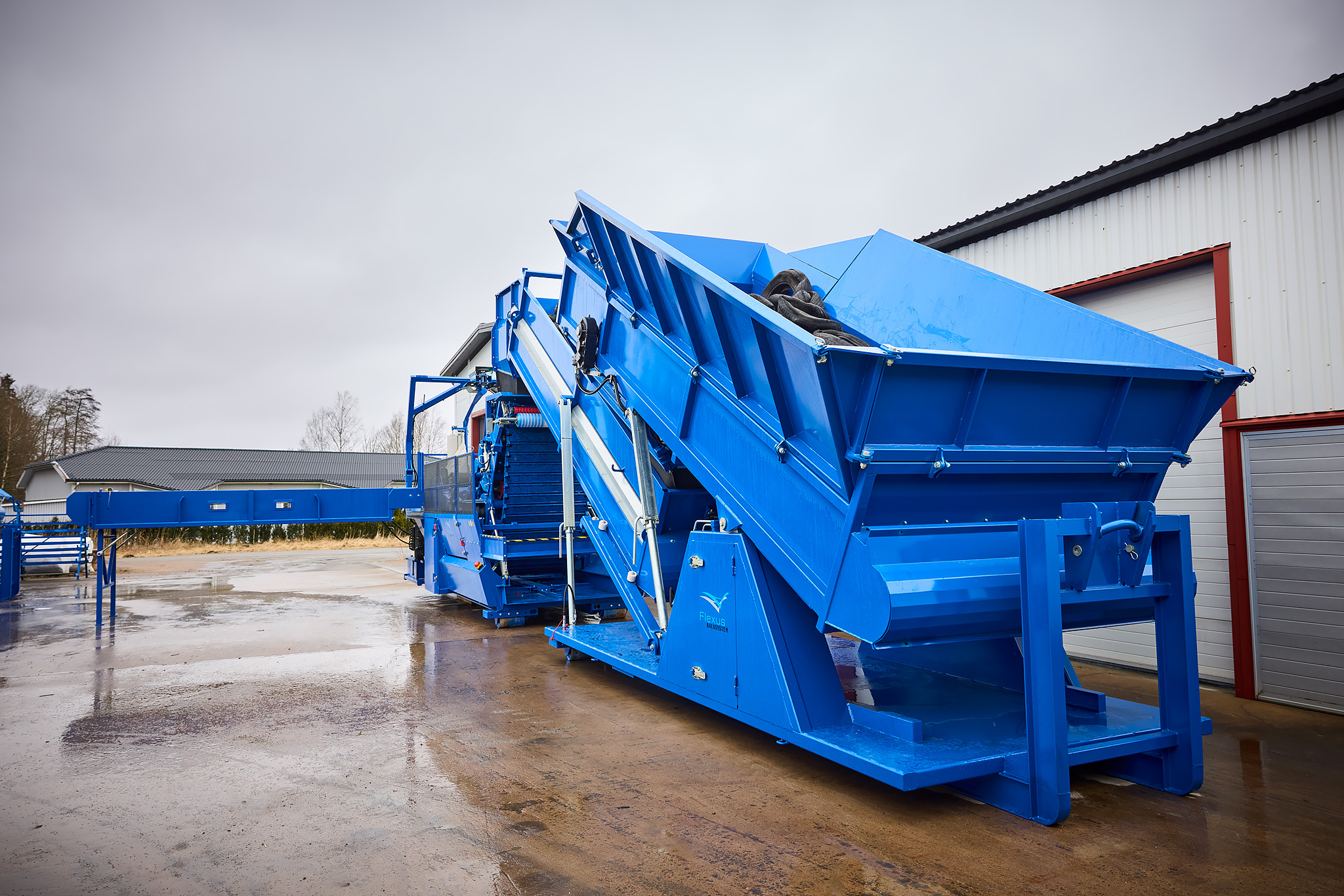 Flexus baling systems are available in different versions and with different capacities. What the systems have in common is that they consist of an infeed conveyor, a baler and a bale conveyor, which can hold up to three finished bales. The central part is the baler where the material is compressed. In the conveyors, chains are used to drive the conveyor belts. The correct tension of the chains is important for optimal operation of the conveyors.